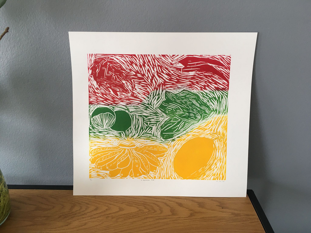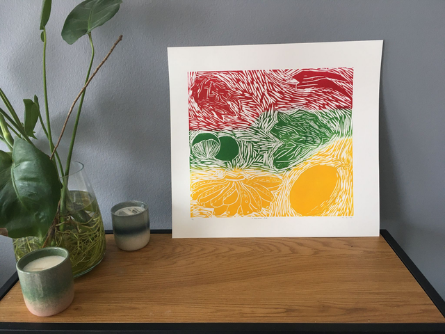 The design is based on some photographs of different fruit and vegetables by Pip Cree. 1 of 10 original, handmade woodcut prints on paper. There is some small variance between the same prints because of the handmade nature of printing; the images are indicative of the finished print you will receive. Print dimensions: 32.8x29.8cm Paper dimensions: approx 42x38.5cm Framing: Unmounted and unframed. All prints are numbered, signed and named.
