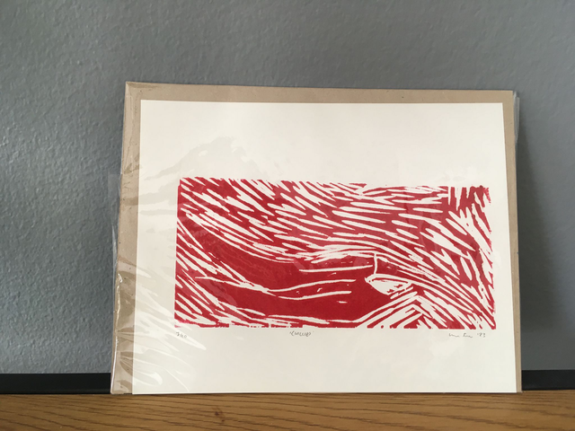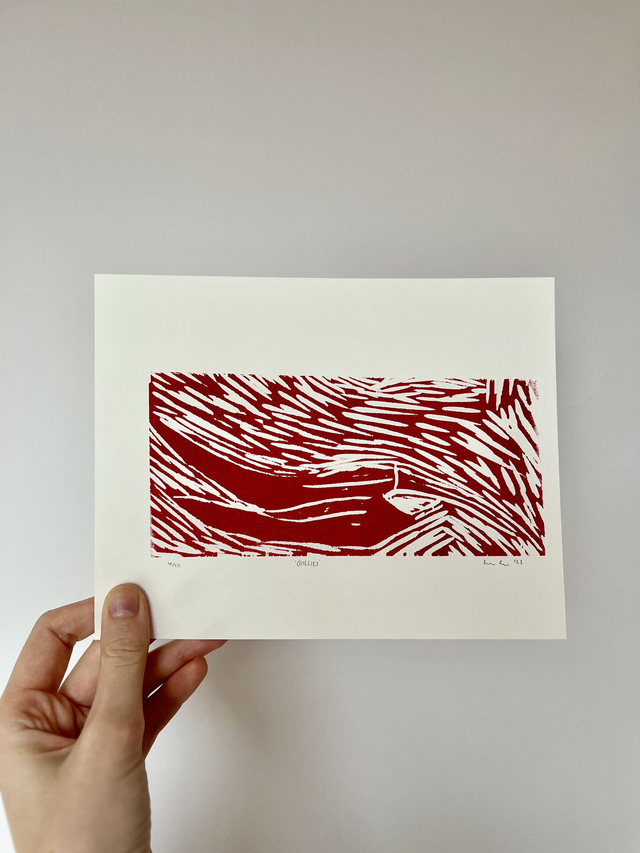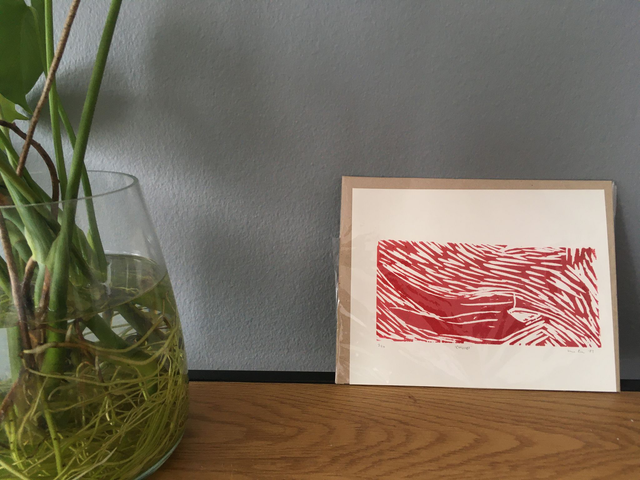 1 of 10 original, handmade woodcut prints on paper. There is some small variance between the same prints because of the handmade nature of printing; the images are indicative of the finished print you will receive. Please note that if mounting the image for framing, some of the edge of the print will be covered as it is up to the edge of the paper.