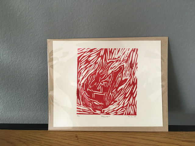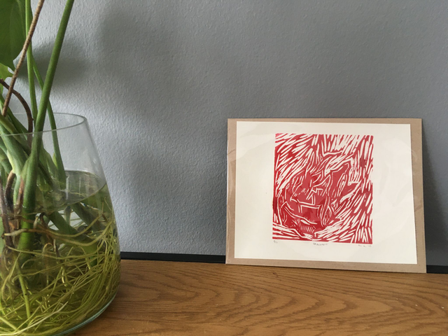 1 of 10 original, handmade woodcut prints on paper. There is some small variance between the same prints because of the handmade nature of printing; the images are indicative of the finished print you will receive. Please note that if mounting the image for framing, some of the edge of the print will be covered as it is up to the edge of the paper.