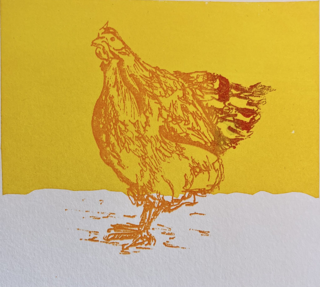 1 of 19 original silkscreen prints on paper. Each print is a unique combination of background colours and chickens.