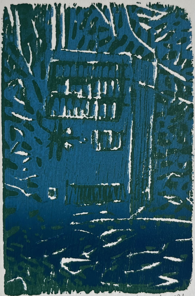 A two layer woodcut print. It features a lonely vending machine, all on its own in the middle of a forest near Hakone, Japan. This is 1 of 8 prints.