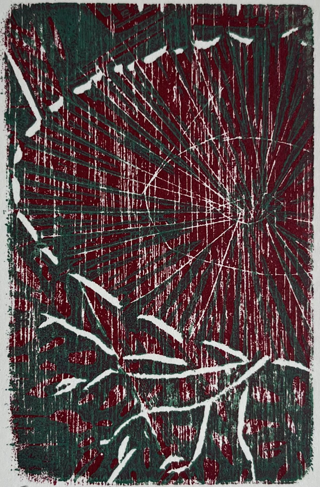 A two layer woodcut print. It is based on an umbrella seen in Takayama, Japan. This is 1 of 8 prints.